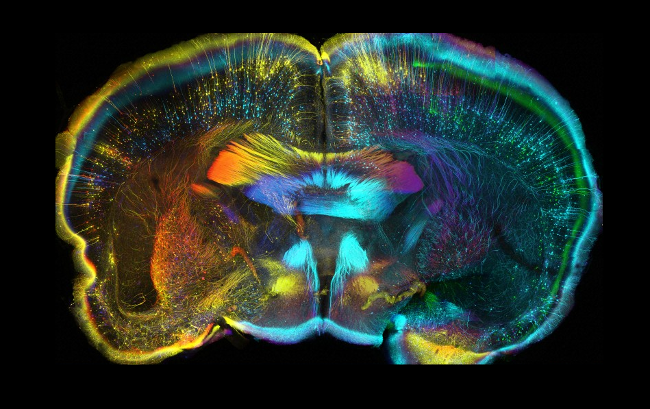Este encéfalo de camundongo foi fotografado em um microscópio na vista coronal, ou seja, dividindo a frente da parte de trás do encéfalo. Para criar essa imagem o tecido foi tratado para ficar transparente o que permite que estruturas profundas sejam vistas mais facilmente. Em seguida, o corte recebeu uma luz que identifica neurônios fluorescentes transgênicos, ou seja, que possuem uma proteína verde fluorescente também chamada de GFP. A GFP foi descoberta na década de 60 por Osamu Shimomura na água-viva Aequorea Victoria que era fluorescente. Pela descoberta e pelo desenvolvimento da GFP como importante ferramenta de pesquisa na biologia, Shimomura ganhou o Nobel de Química de 2008. Desde então, a GFP tem sido usada para dar fluorescência à células, neste caso neurônios. Ela é acrescentada ao genoma dos animais, assim seus neurônios produzem GFP e ficam fluorescentes. Esses animais são então transgênicos, ou seja, foi acrescentado ao genoma um gene da água-viva que gerará uma proteína que normalmente não produzem. Na foto acima, a GFP não está verde porque as cores foram transformadas de acordo com a profundindade dos neurônios. Neurônios mais superficiais são vermelhos e conforme são mais profundos são laranjas, amarelos, roxos, azuis e verdes. Essa foto ficou entre as 20 melhores imagens em ciência do ano e recentemente foi capa da revista Neuron, uma das revistas de Neurosciência mais lidas do mundo.